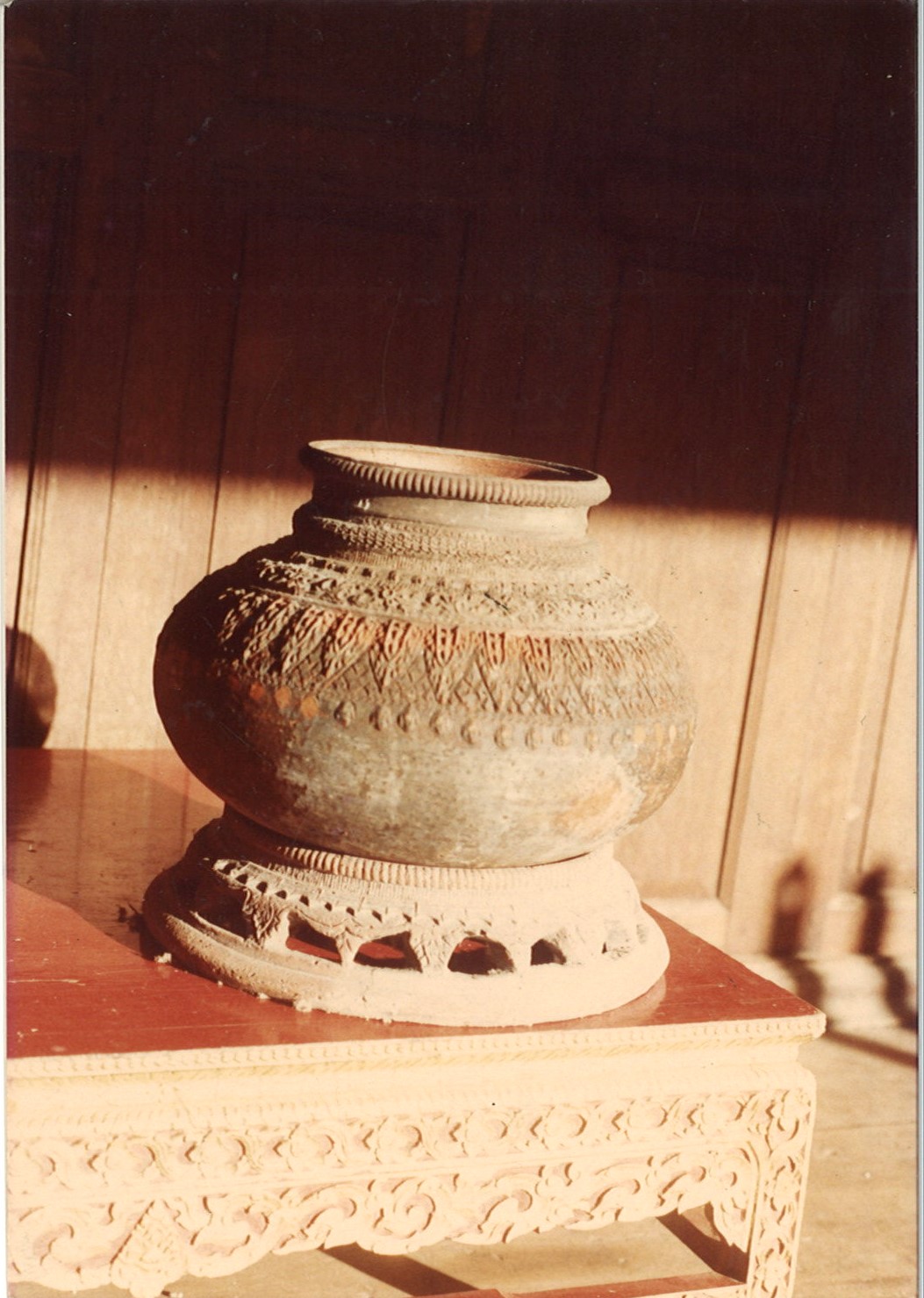 เครื่องปั้นดินเผาสลักลายวิจิตร ทรงก้นกลมคอสูง ประกอบด้วยตัวโอ่งและขารอง ขอบโอ่งด้านปากโอ่งแต่งเป็นลายพูมะยม บ่าหรือไหล่ของโอ่งแต่งเป็นลายกลีบบัวคว่ำ บริเวณรอบคอโอ่งแต่งเป็นลายพวงมาลัย ขารองฉลุโปร่งแต่งลายพูมะยมที่ขอบเป็นเครื่องปั้นดินเผาของพิพิธภัณฑ์บ้านกวานอาม่าน ต. เกาะเกร็ด จ. นนทบุรี