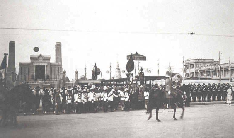พระบาทสมเด็จพระปกเกล้าเจ้าอยู่หัวพระราชดำเนินโดยกระบวนพยุหยาตราใหญ่ทางสถลมารคข้ามสะพานพระพุทธยอดฟ้าไปยังฝั่งธนบุรีในพระราชพิธีเฉลิมพระนคร ครบ 150 ปี