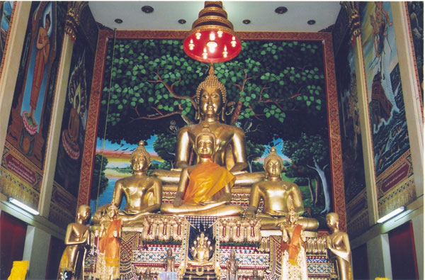 NP067 พระพุทธรูปประดิษฐานภายในพระอุโบสถวัดเสาธงหิน ถ่ายระยะไกลหน้าตรงด้านขวาแนวตั้ง ทำให้มองเห็นพระธานและพระสาวกพร้อมทั้งเครื่องบูชา