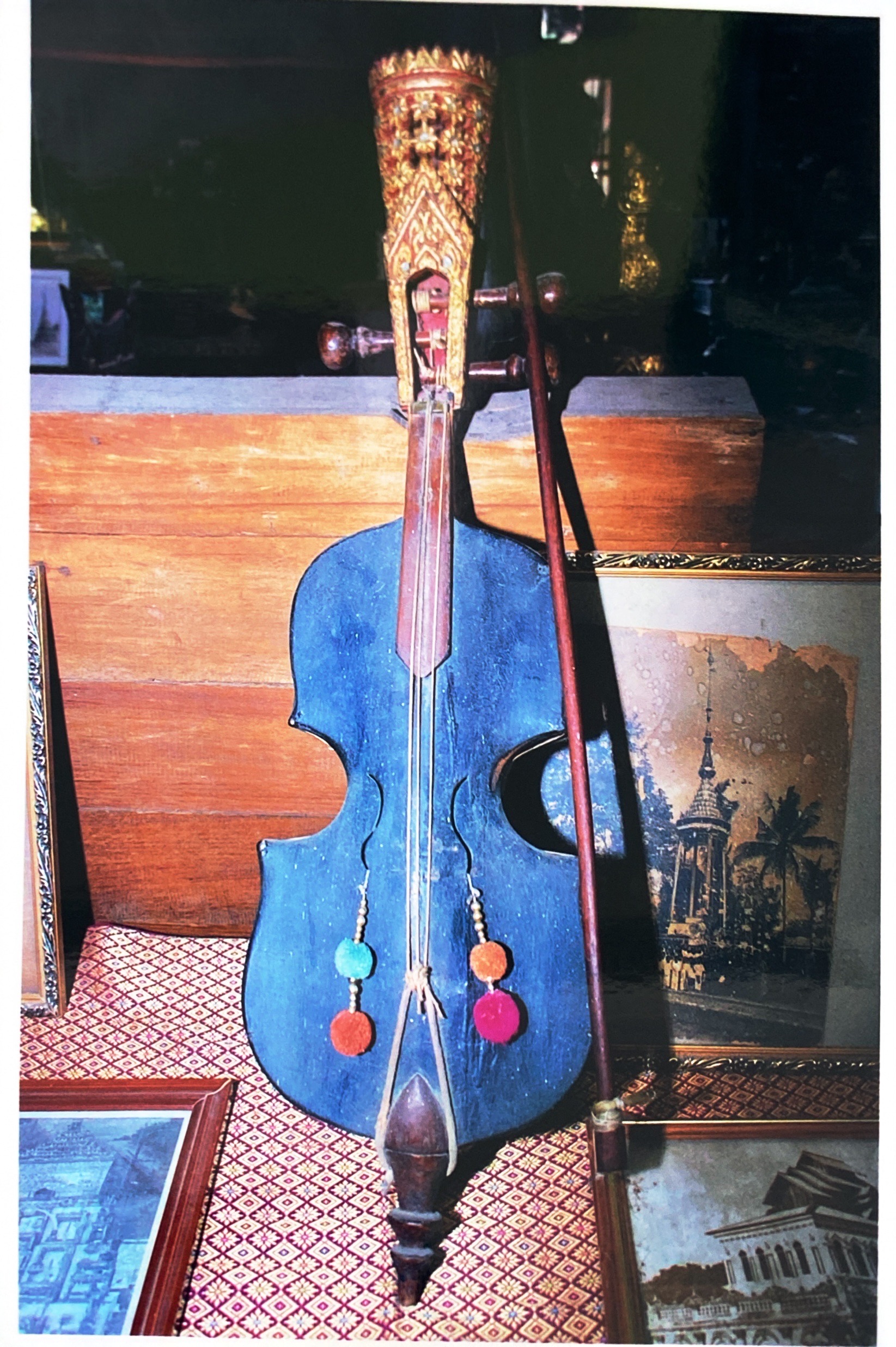เครื่องดนตรีประเภทเครื่องสี มีลักษณะคล้ายไวโอลิน มี 3 สาย การบรรเลงผู้บรรเลงซอต้องนั่ง ตั้งซอไว้กับพื้นแบบสีซอสามสายของไทย ใช้บรรเลงประกอบวงเครื่องสายมอญ ประกอบด้วย จะเข้ ซอ ขลุ่ย ฉิ่ง และ กลอง ซอมอญตัวนี้มีอายุประมาณศตวรรษที่ 24