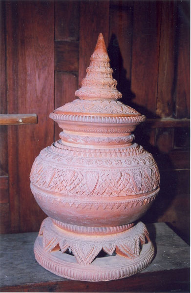 หม้อน้ำลายวิจิตรทรงก้นกลม คอสูงต้นแบบตราสัญลักษณ์จังหวัดนนทบุรี ถ่ายเมื่อ ธ.ค.2549 (ภาพจากพิพิธภัณฑ์กวานอาม่าน)