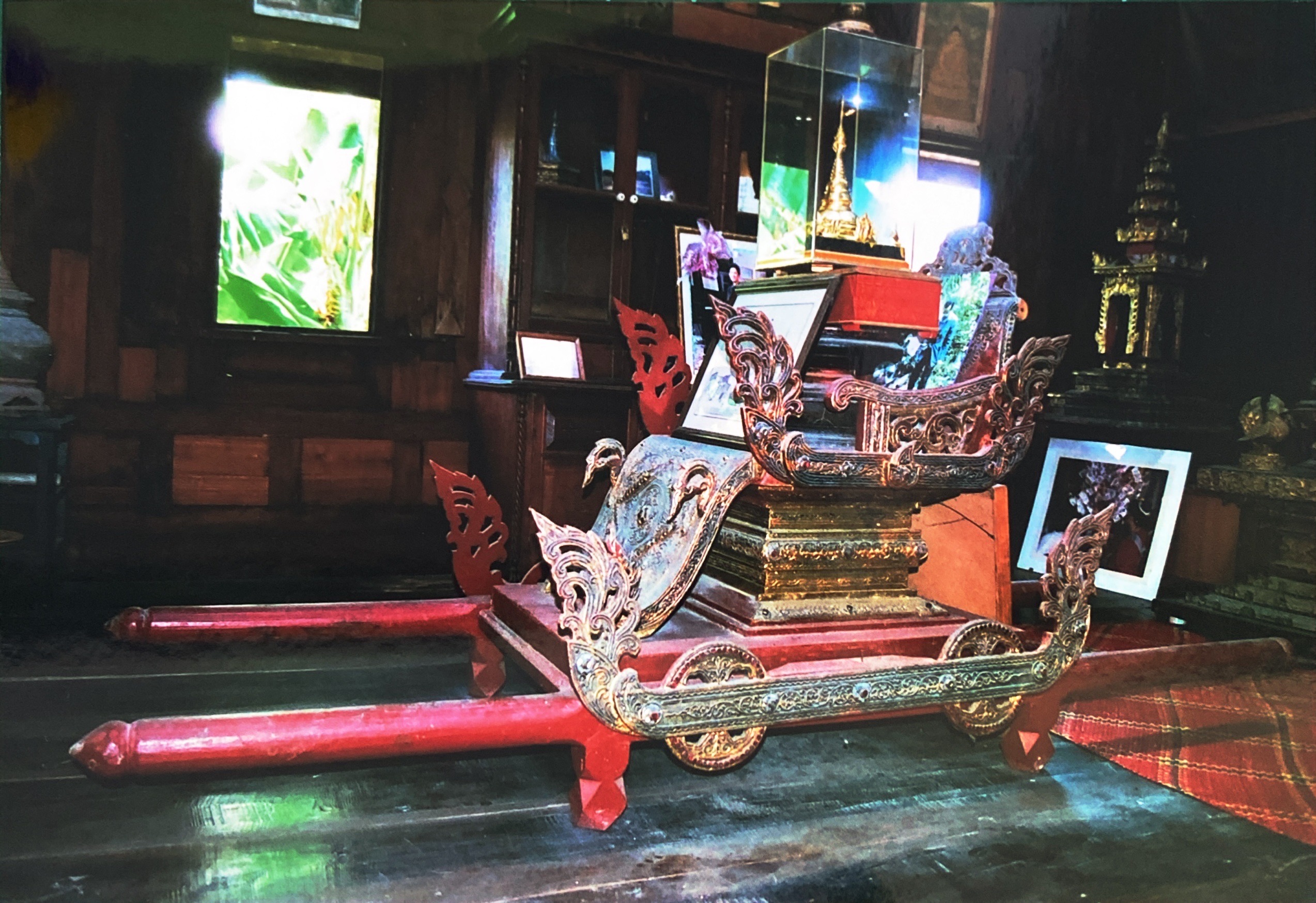 เสลี่ยงมอญใช้ในการอันเชิญพระพุทธรูป พระธาตุ บวชเณร และสำหรับเป็นที่นั่งของผู้มีบรรดาศักดิ์ มีคานหาม ใช้คนหาม 4 คน มีอายุประมาณพุทธศตวรรษที่ 23 เสลี่ยงมอญนี้มีความกว้างประมาณ 80 ซม. ความยาวประมาณ 240 ซม. และความสูงประมาณ 110 ซม.