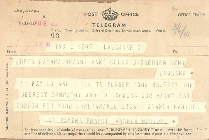 พระราชโทรเลขจากสมเด็จพระเจ้าอยู่หัวอานันทมหิดล ถึงสมเด็จพระนางเจ้ารำไพพรรณี พระบรมราชินีในรัชกาลที่ 7.