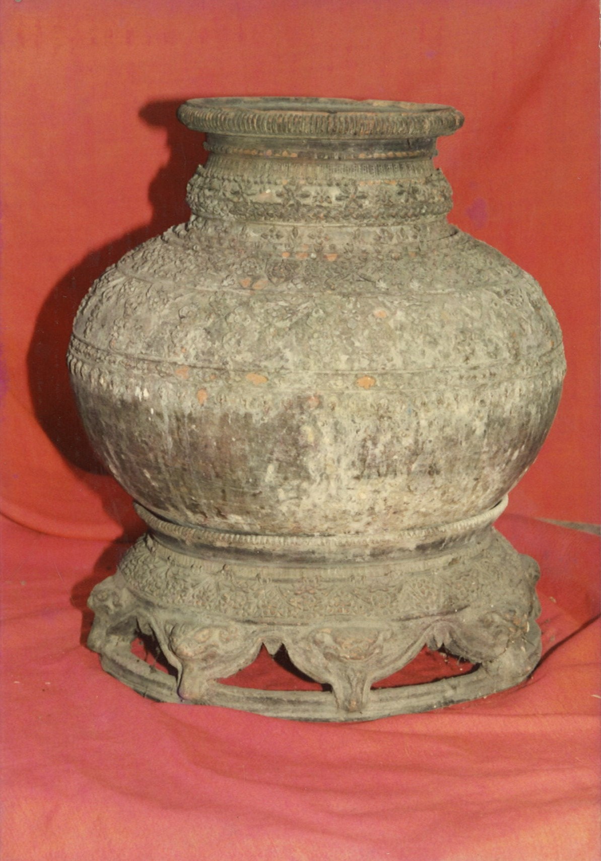 เครื่องปั้นดินเผาสลักลายวิจิตร มีตัวโอ่งและขารอง ที่คอของตัวโอ่งคาดด้วยลายพวงมาลัย ประดับลายดอกไม้ ขารองฉลุโปร่งรูปหน้าสิงห์ เป็นเครื่องปั้นของชาวบ้านเกาะเกร็ด ที่นำมาประกวดในงานฉลองครบรอบ 100 ปี วัดปรมัยยิกาวาส วันที่ 22 มีนาคม 2528