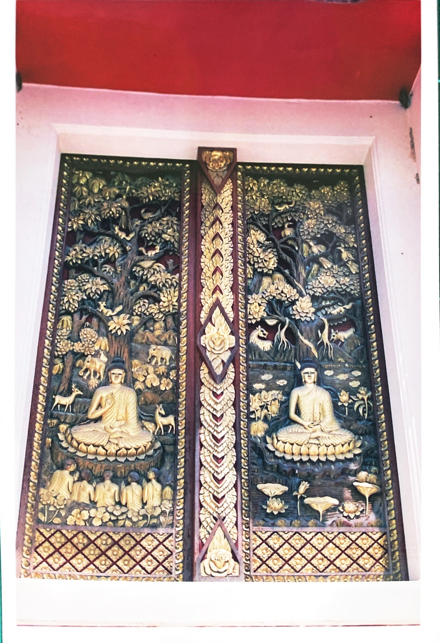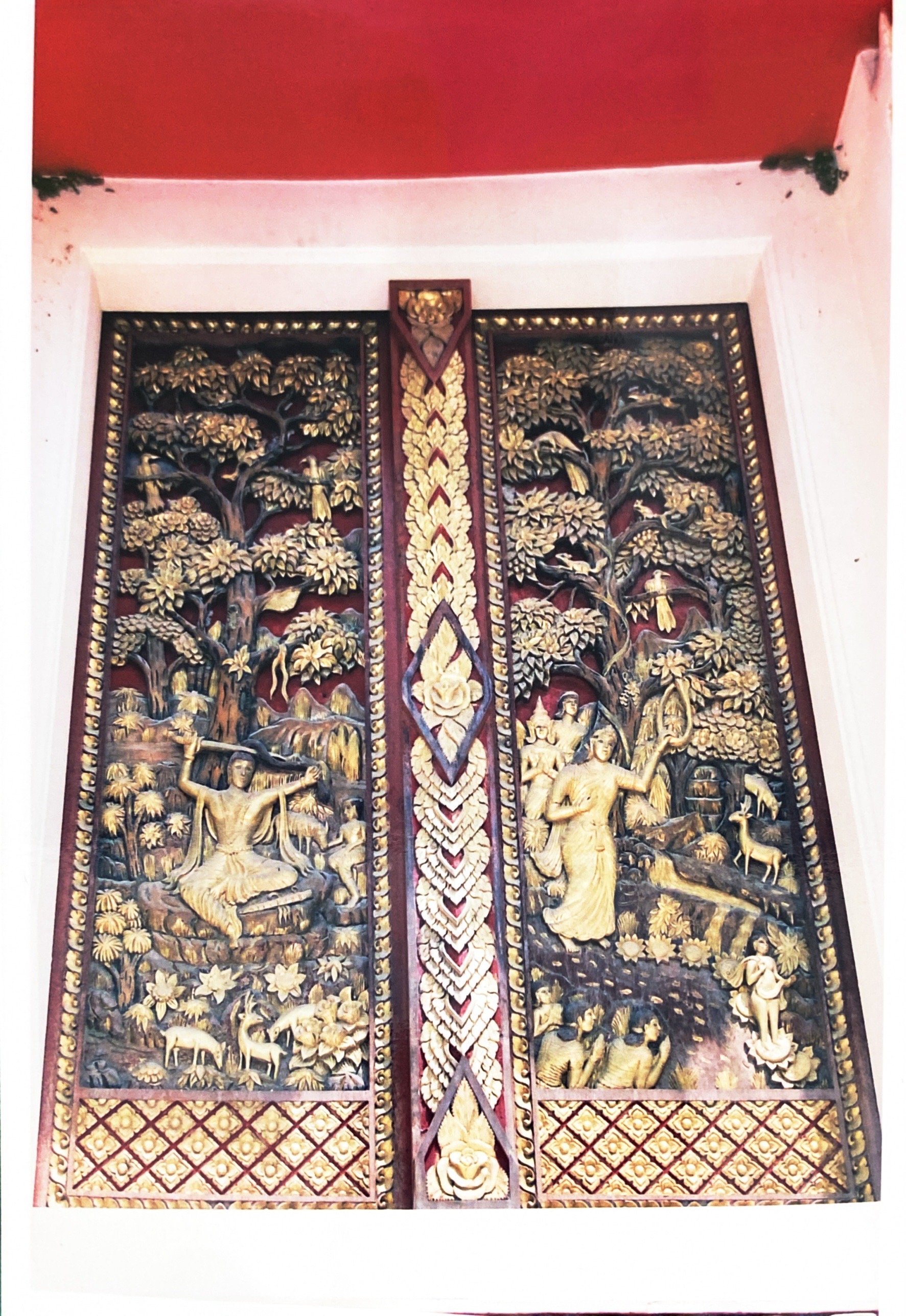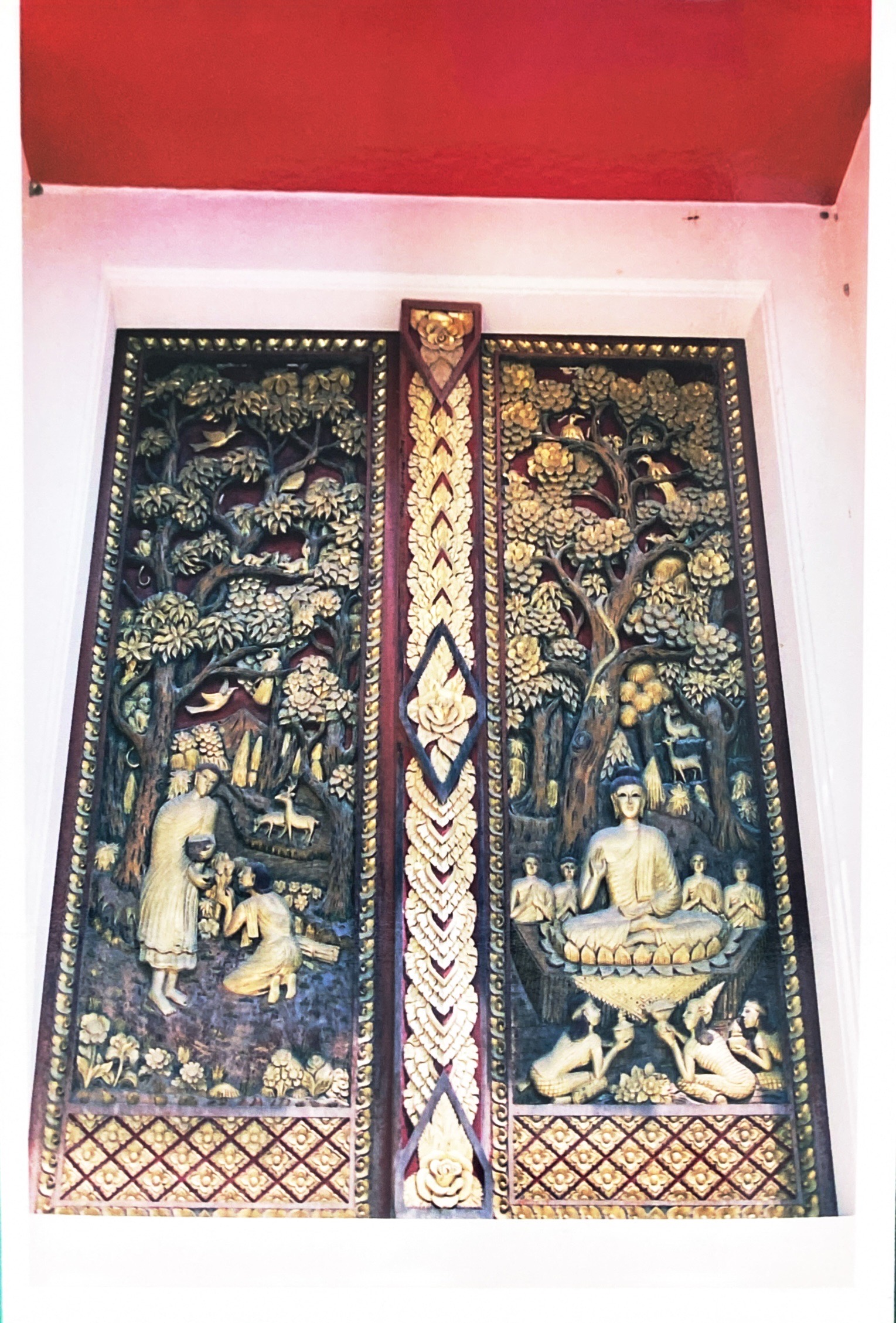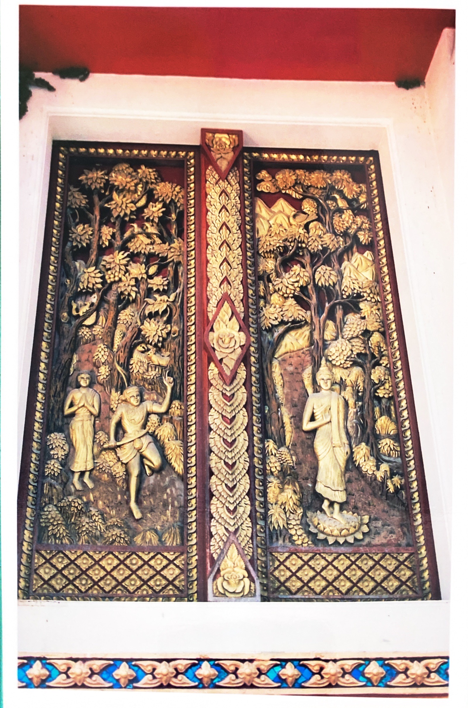 ลายจำหลักไม้ภาพพุทธประวัติที่บานหน้าต่างวัดป่าเลไลยก์