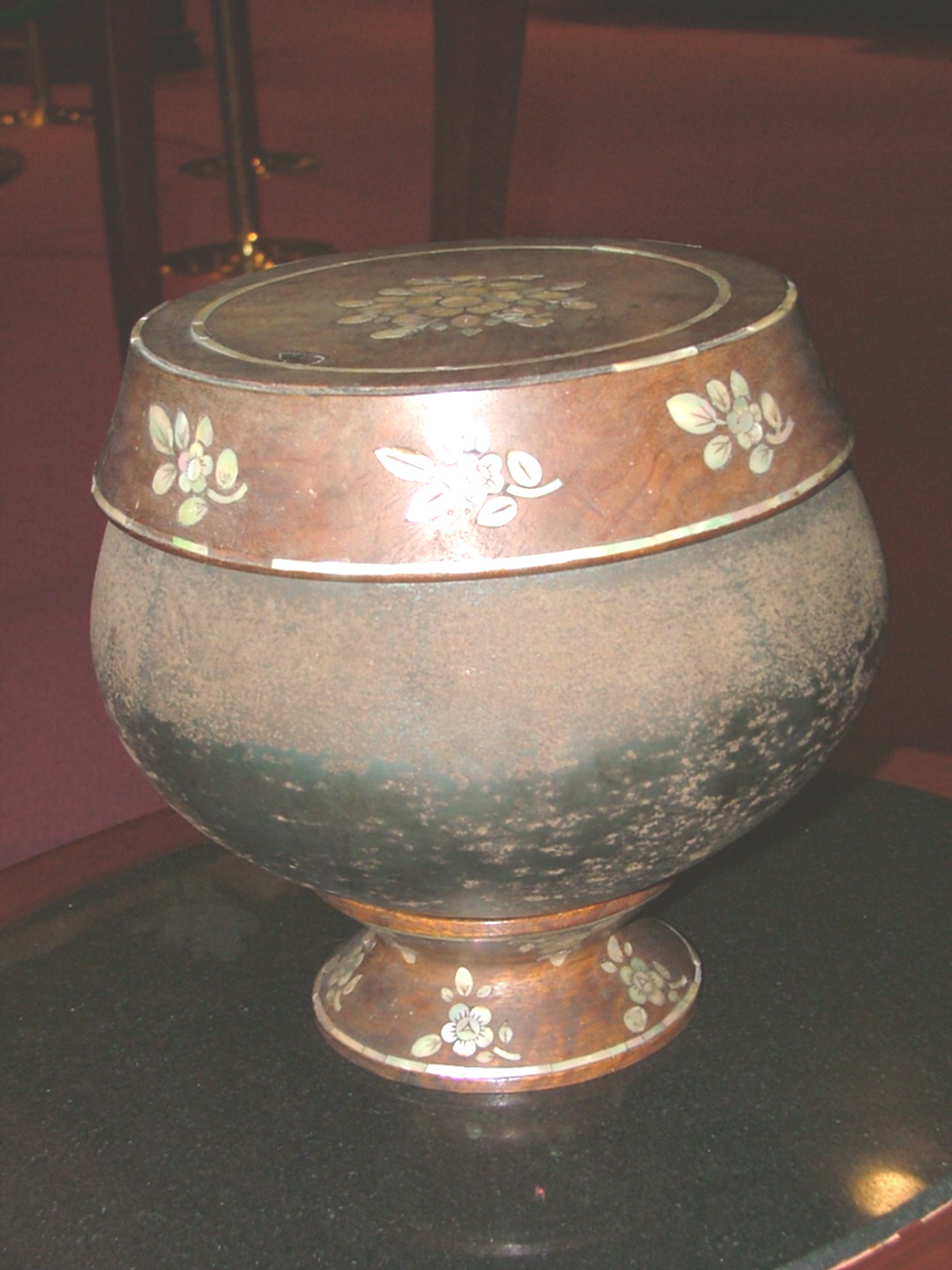 เชิงบาตรและฝาบาตรทำด้วยไม้ละมุดป่า ฝังมุก และมีคำจารึกว่า วังศุโขทัยที่เชิงบาตร