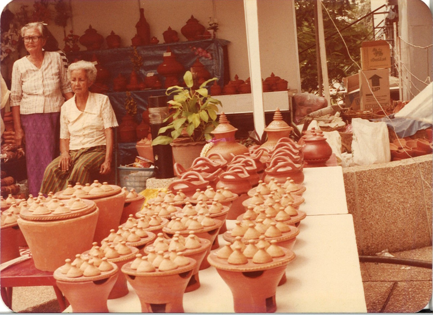 เครื่องปั้นดินเผาบ้านบางตะนาวศรี อ.เมือง จ.นนทบุรี ประกอบด้วยหม้อข้าว หม้อกะรัน กระทะ กระทะขนมครก ผลงานของช่างปั้น บ้านบางตะนาวศรี นางเฉลียว ทรรพสุทธิ (คนนั่ง) และนางเฉลิม เทศทิม ในงานส่งเสริมวัฒนธรรม พ.ศ. 2530